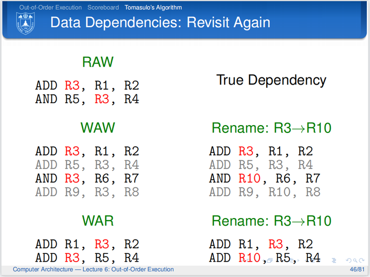 而且记分牌为了乱序执行指令,在碰到写后写、读后写这两个冒险的时候也会暂停流水线(为什么这里不提写后读呢,见后文),而这其实是不必要的,因此记分牌算法还是没有最大限度地挖掘出指令的乱序潜力。而且记分牌的“写回”是乱序的,乱序完成指令不利于处理器处理中断、异常等情况,不利于程序员debug程序。