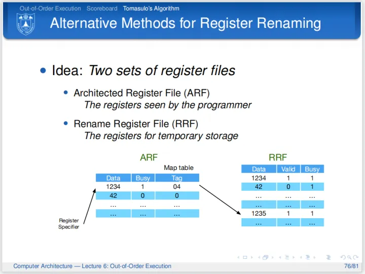 可以在逻辑寄存器(MIPS指令集规定了32个逻辑寄存器)之外额外有一组物理寄存器,结构如图。假如逻辑寄存器正要被改写或被读,就置Busy位为1,并通过Tag指示最新数据将被写到哪一个物理寄存器。通过这样的方法,我们可以在新数据计算完毕时立刻写回,同时也允许前序指令读取寄存器旧值(因为旧值没有被覆盖,它还存在于逻辑寄存器中)。