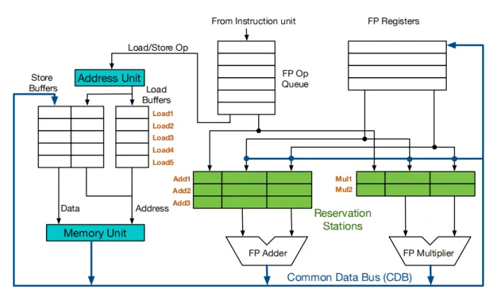 - 青绿色模块是加法单元和乘法单元的保留站(保留站是什么?保留站保留已经发射的指令的信息和缓冲下来的数据。关于保留站,后文会有更多介绍);