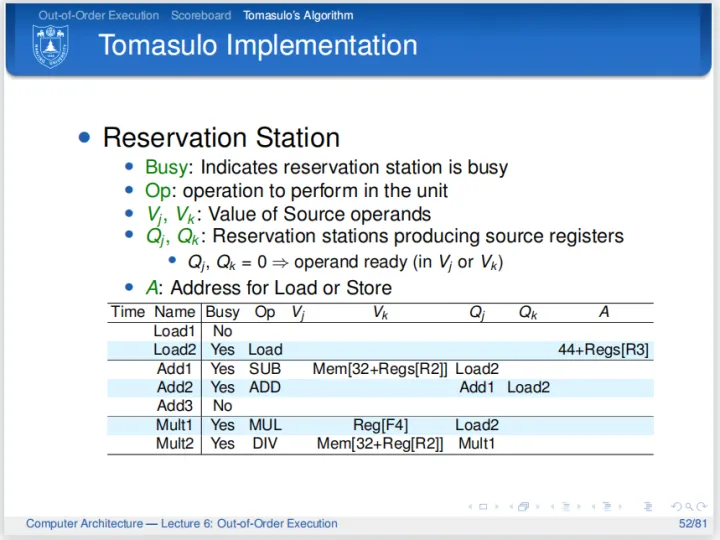 保留站的结构有点像cache,可能有多行数据,每一行都对应一条被发射到保留站的指令。保留站每一行都有Busy位,指示这一行是否现存有指令;Vj和Vk与记分牌不同,记分牌的Vj和Vk会记录源寄存器的编号,而保留站则直接把能读取的数据直接拷贝到保留站中,可想而知,一旦数据进入保留站,那对应的寄存器就和这条指令没瓜葛了;Qj和Qk的信息和记分牌一样,记录尚不能读取的数据将由哪条指令算出;A是存储指令的地址,用于存放立即数和计算得到的地址数据。