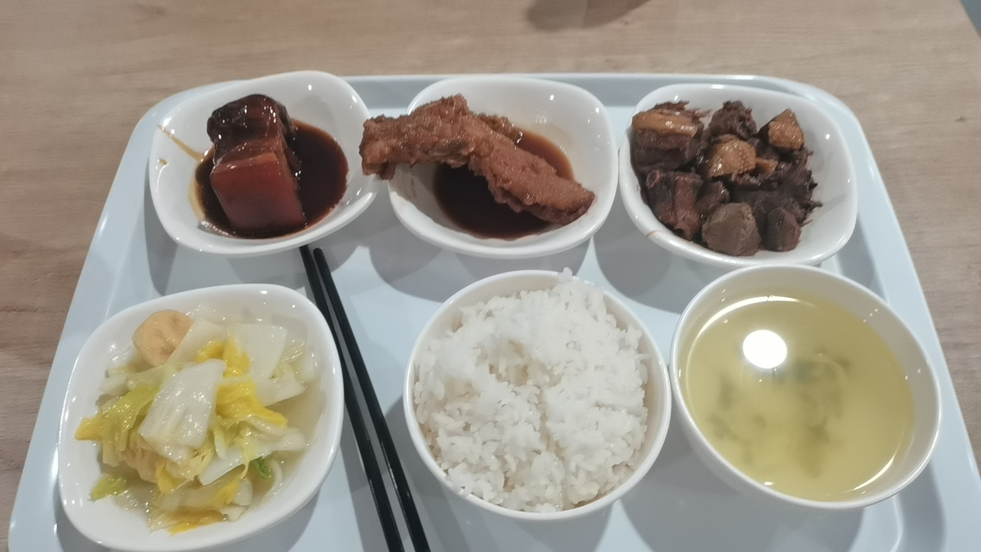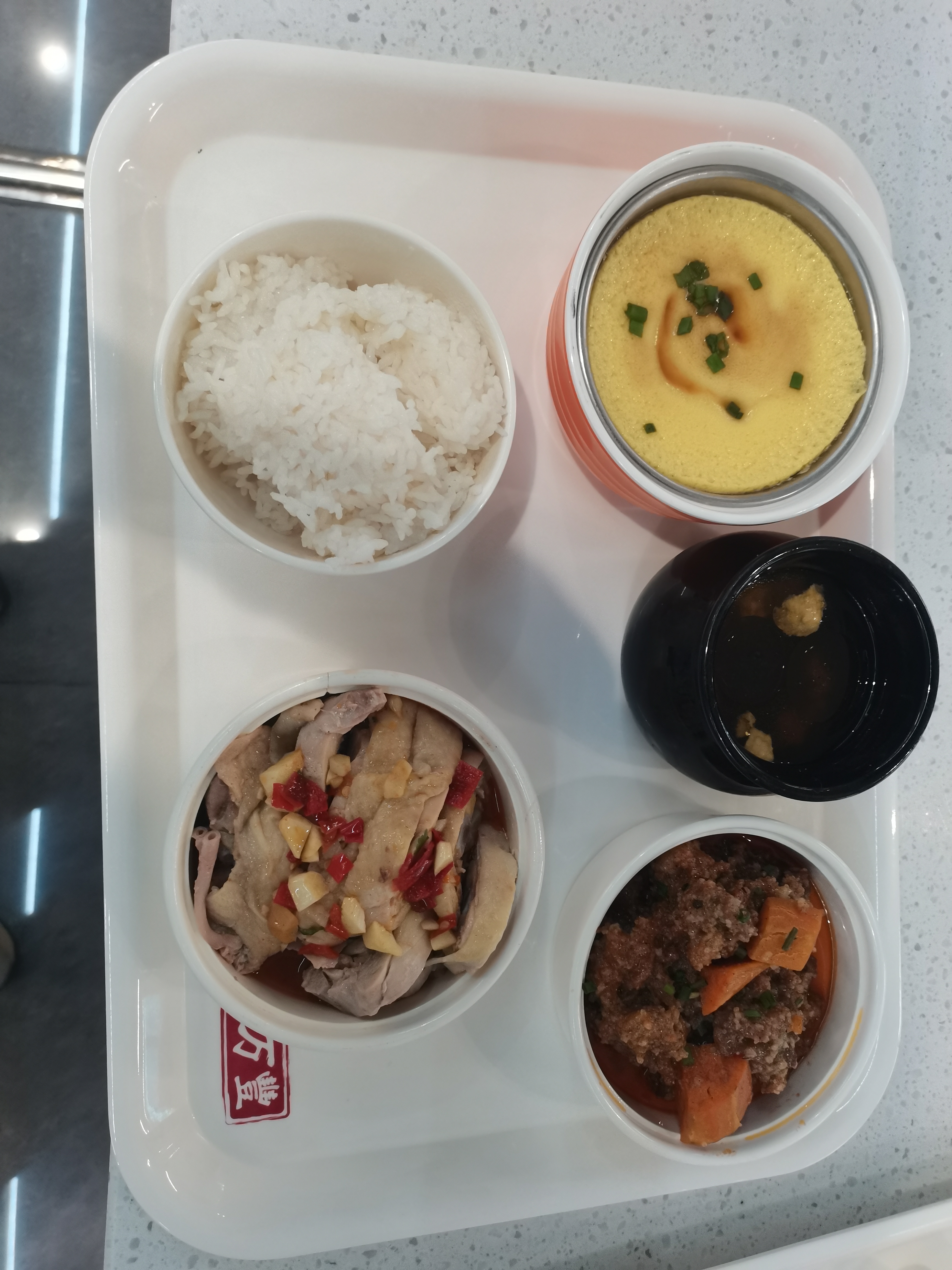 听完会议厅就上4楼去食堂就餐,食堂的饭菜很多种多样,我点了粉蒸肉、口水鸡、蒸蛋、瓦罐煨汤,结果也没花很多钱,感觉比学校强(乐),不过仔细品尝还是和外面的饭店不能比,尝起来味道还不够到位。