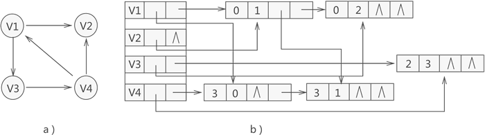 每个元素包含两个域,一个存储图的一个顶点信息,另一个是一个指针,指向该顶点的边构成的链表。